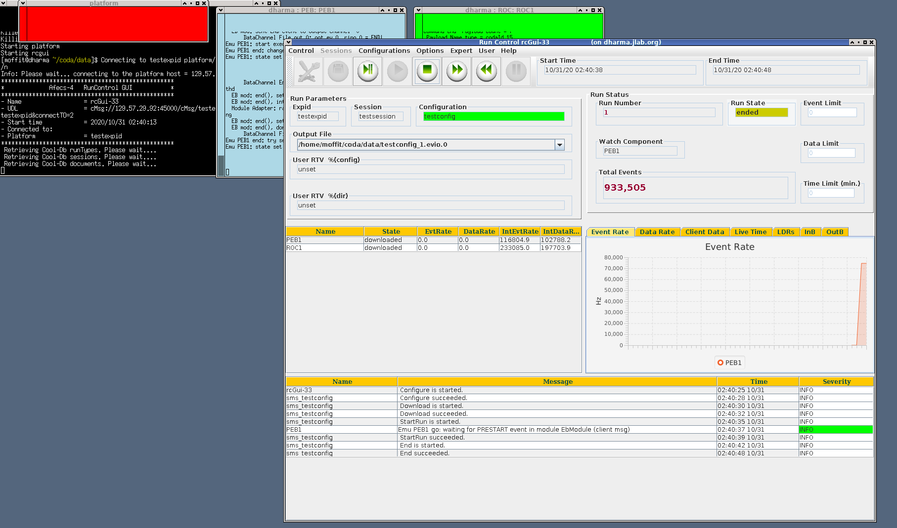 Three xterms should appear with the Platform, PEB1, and ROC1. The RunControl GUI appeared shortly afterwards: